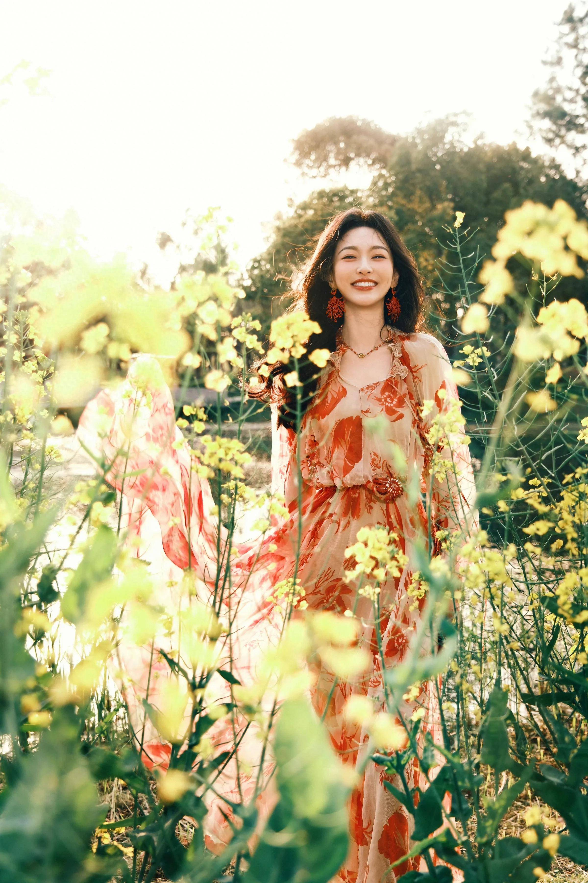 橘红色,这种充满活力与热情的色彩,本身就自带一种张扬的魅力。当它被运用到碎花裙上时,瞬间为整个造型注入了无限生机。唐嫣所穿的这条橘红色印花连衣裙,印花图案精致而细腻,仿佛是从莫奈的花园中直接采摘下来的花朵,带着自然的芬芳与灵动。每一朵印花都像是在诉说着一个关于春天、关于浪漫的故事,让人忍不住沉浸其中。